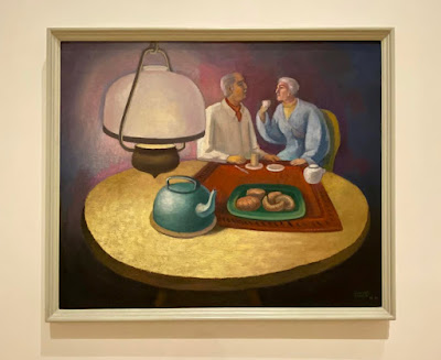 José Chávez Morado retrata en la pintura "Tomando el té" (1988-1991) una tarde de calma entre una pareja de la tercera edad que en una gran mesa comparten pan, té y son iluminados por una linterna más grande que sus cabezas. En esta obra el autor refleja la vida actual y en aquel tiempo, la tranquilidad de muchas personas de la tercera edad que viven en pareja y disfrutan de un rato con té.